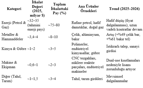 Aşağıdaki tablo, 2025 yılı ana ithalat kategorilerini ve paylarını özetliyor kaynak TÜİK Dış Ticaret İstatistikleri, Ocak-Aralık 2025